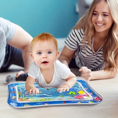 Esta alfombra de agua desarrolla músculos y habilidades sociales mientras mantiene al bebé entretenido con juguetes coloridos flotantes.