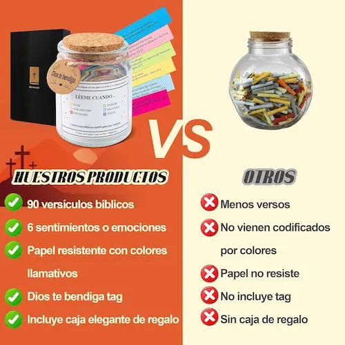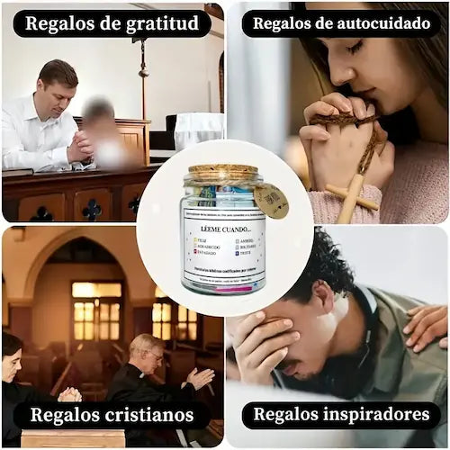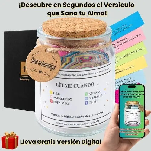 Descubre la guía perfecta para cada momento emocional. El Tarro de la Inspiración incluye versículos bíblicos en seis colores, cada uno pensado para reflejar tus sentimientos y brindarte mensajes edificantes de Dios, transformando emociones negativas en esperanza y paz.