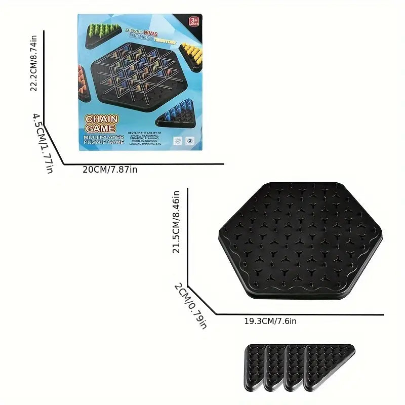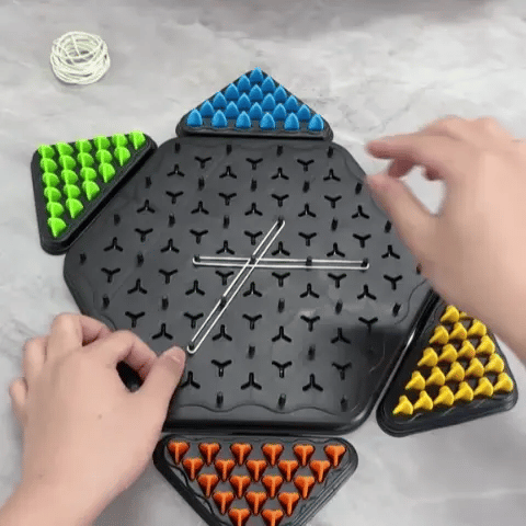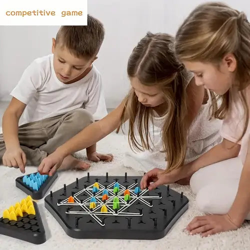 Ayuda a mejorar la observación y la concentración en los niños. Al crear triángulos con bandas elásticas, los jugadores ejercitan su mente y aprenden estrategias.