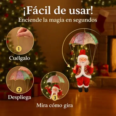 El Santa Paracaidista Musical transforma tu espacio en un lugar mágico. Cuelga, activa la música, y disfruta de la felicidad de los niños y adultos en cada rincón.
